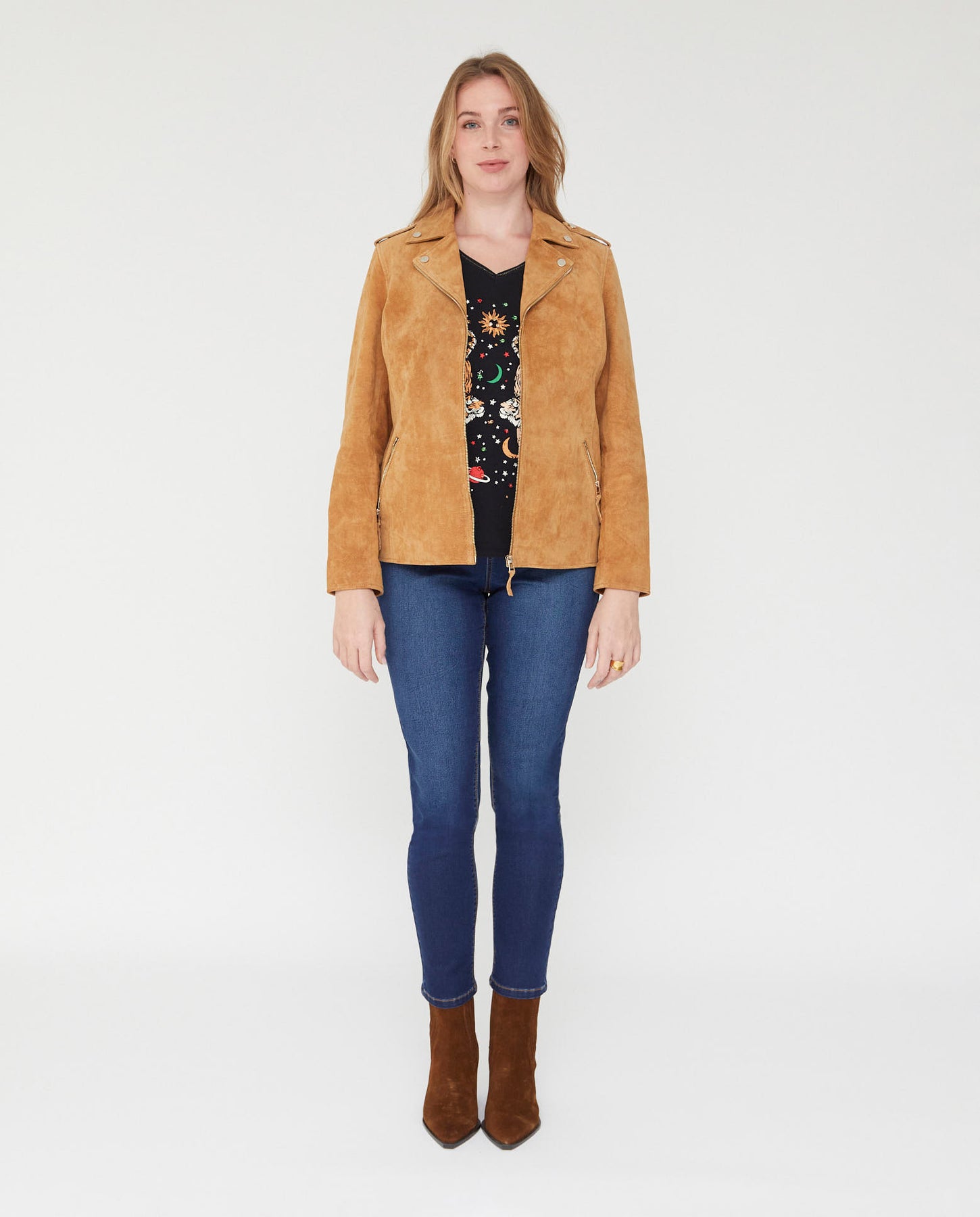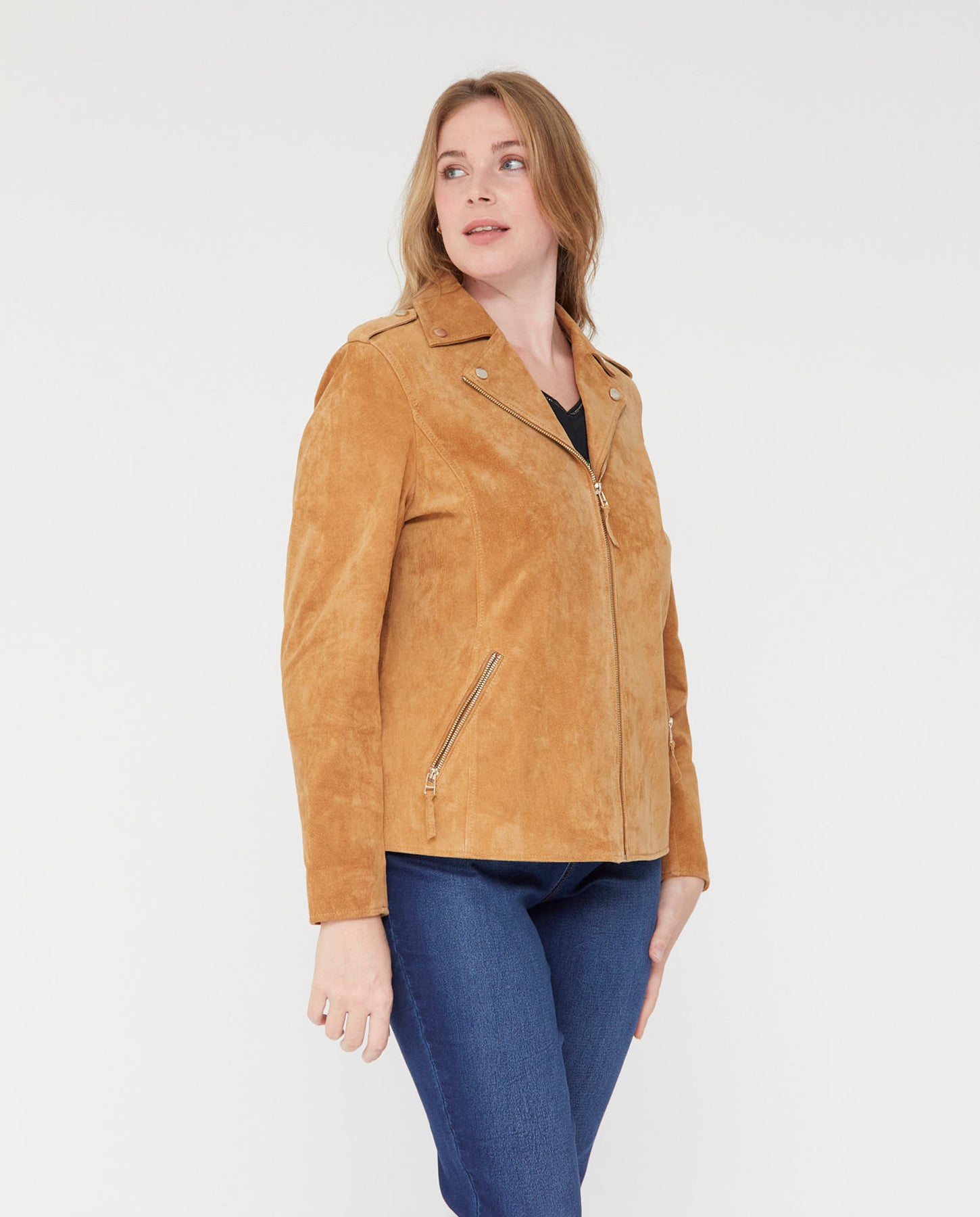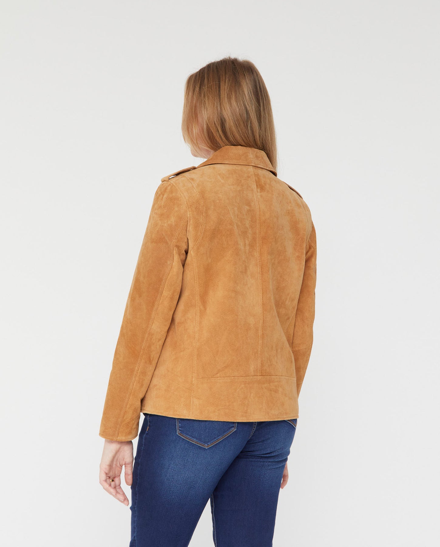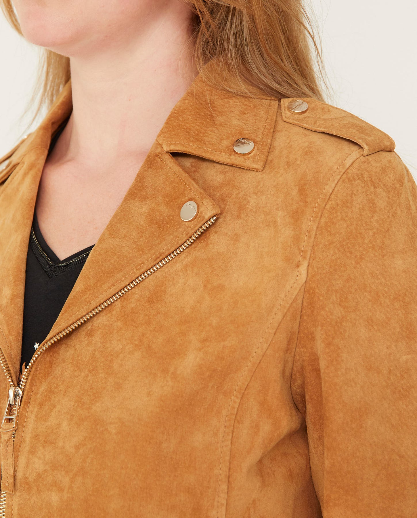 Cazadora ante con cuello solapa y cierre frontal con cremallera metálica. Bolsillos delanteros con cierre de cremallera. Detalle de trabillas en hombros.