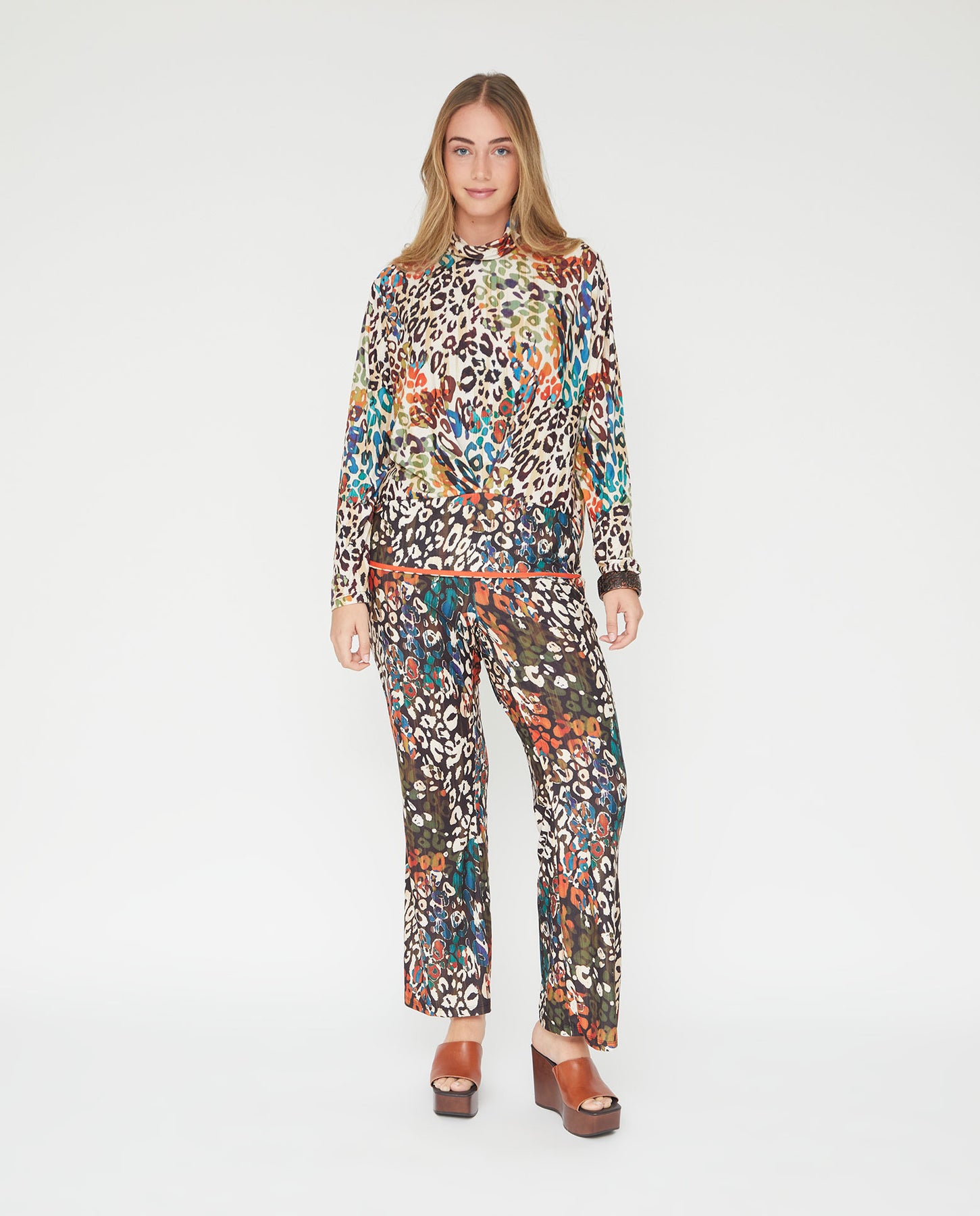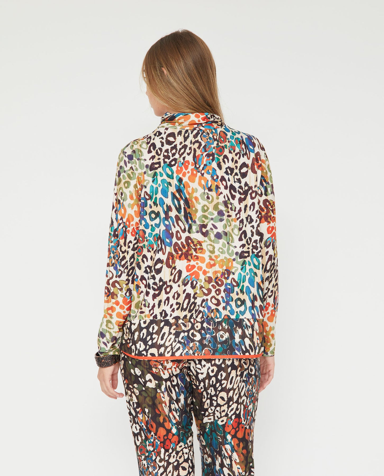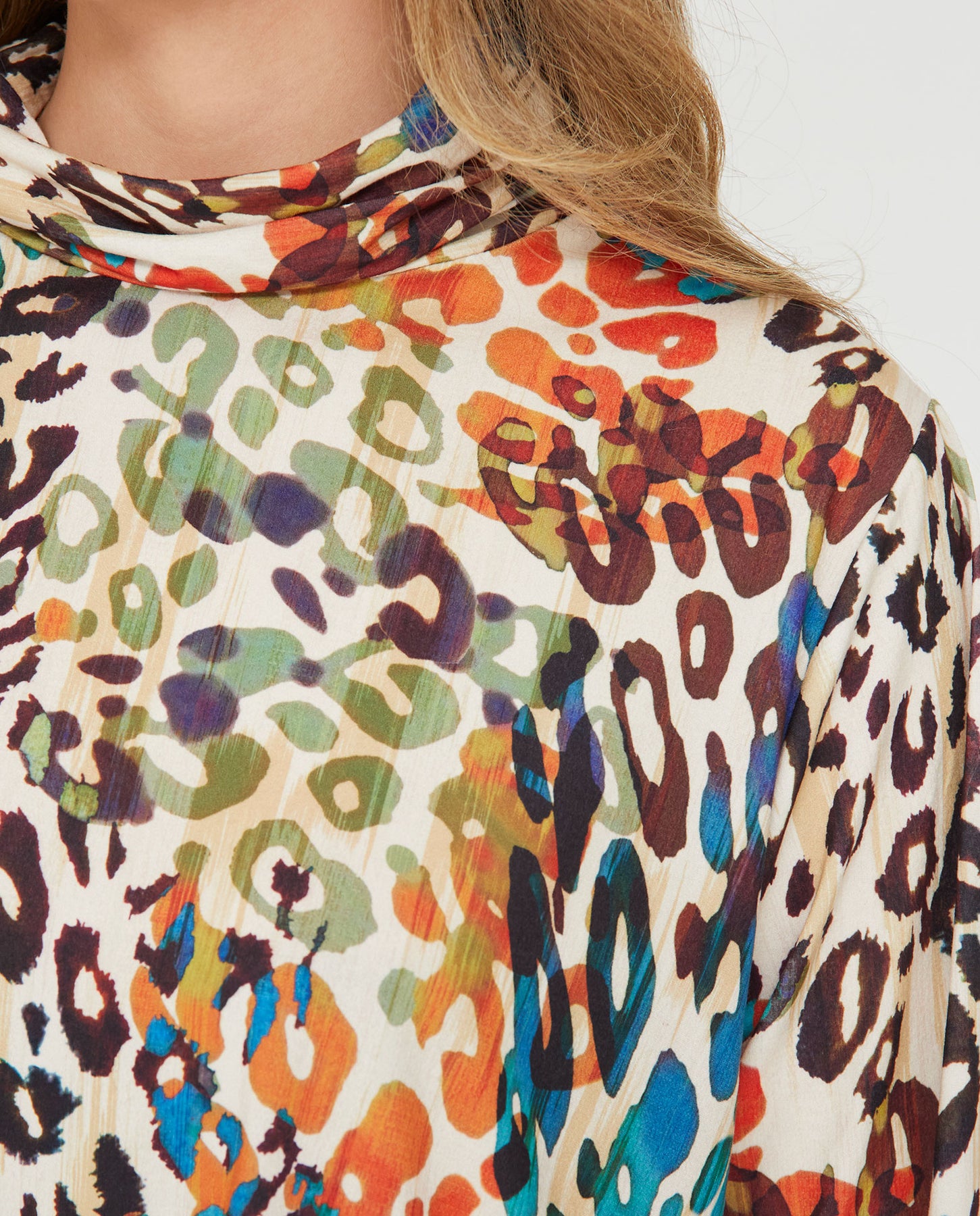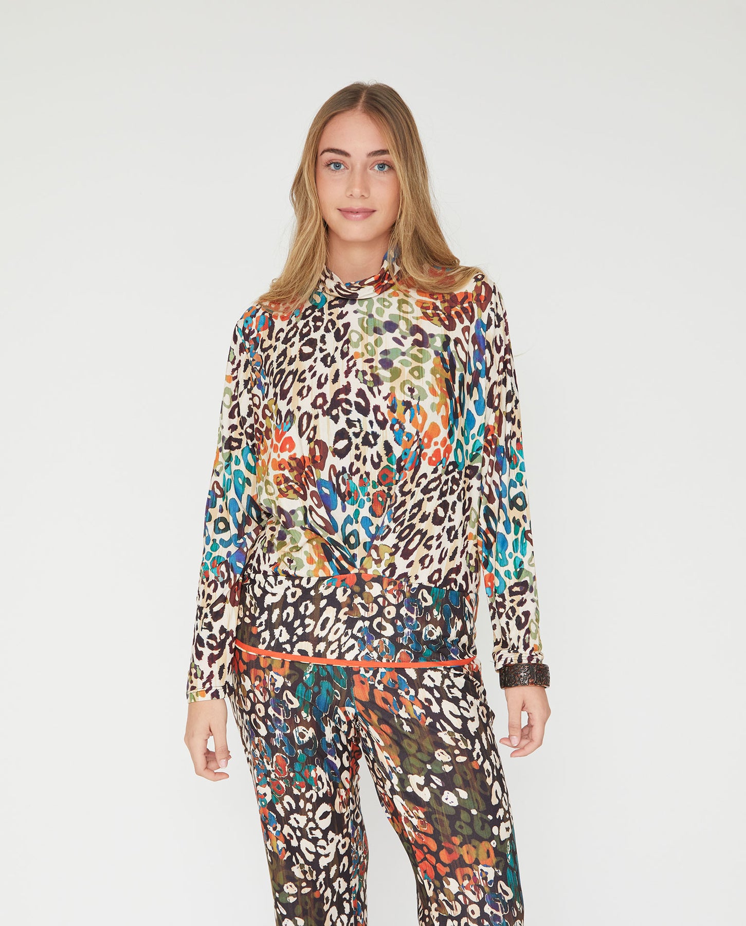 Camiseta estampado de leopardo, cuello alto. Manga larga con piegues en bajo delantero.
