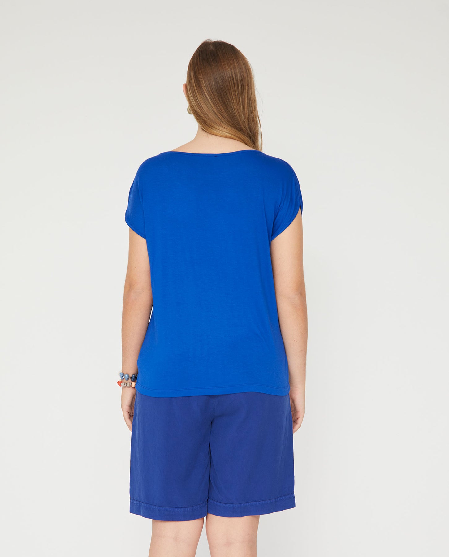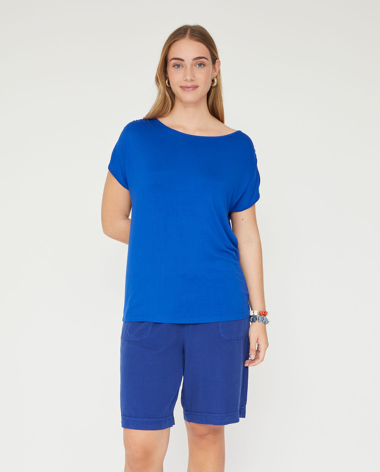 Camiseta cuello redondo con manga caida. Detalle de fruncido en hombros.