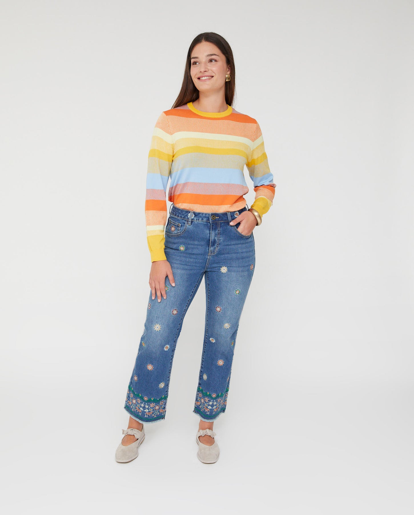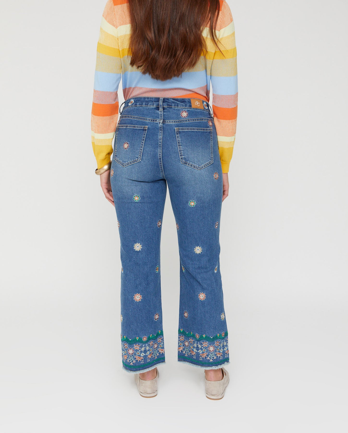 Pantalón denim cinco bolsillos. Pernera recta. Detalle bordados en color de contraste. Cierre frontal con cremallera y botón metálico.