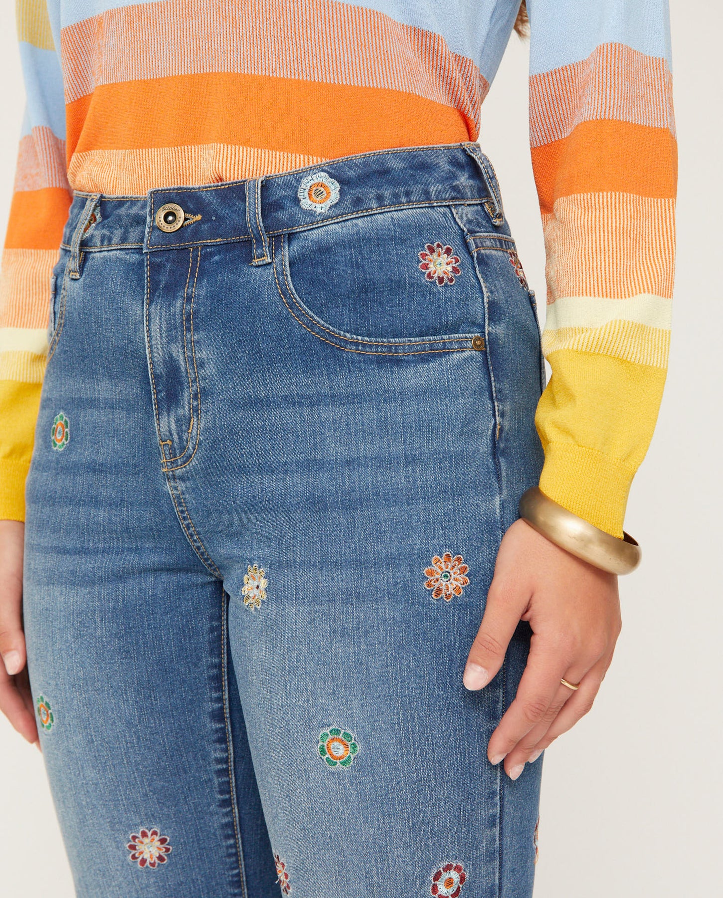 Pantalon Denim Cinco Bolsillos Con Bordados  Azul Medio